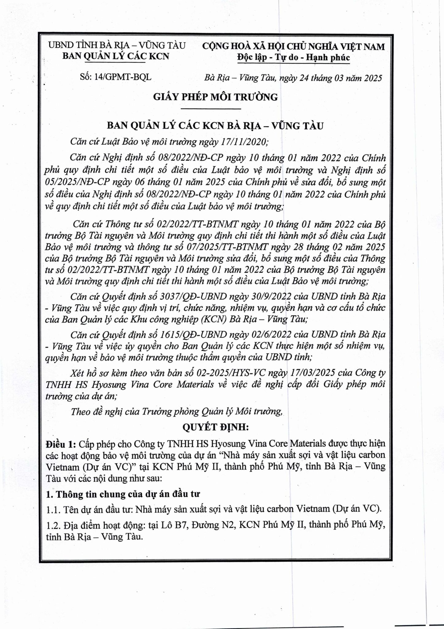 Giấy phép môi trường (cấp điều chỉnh lần 1)